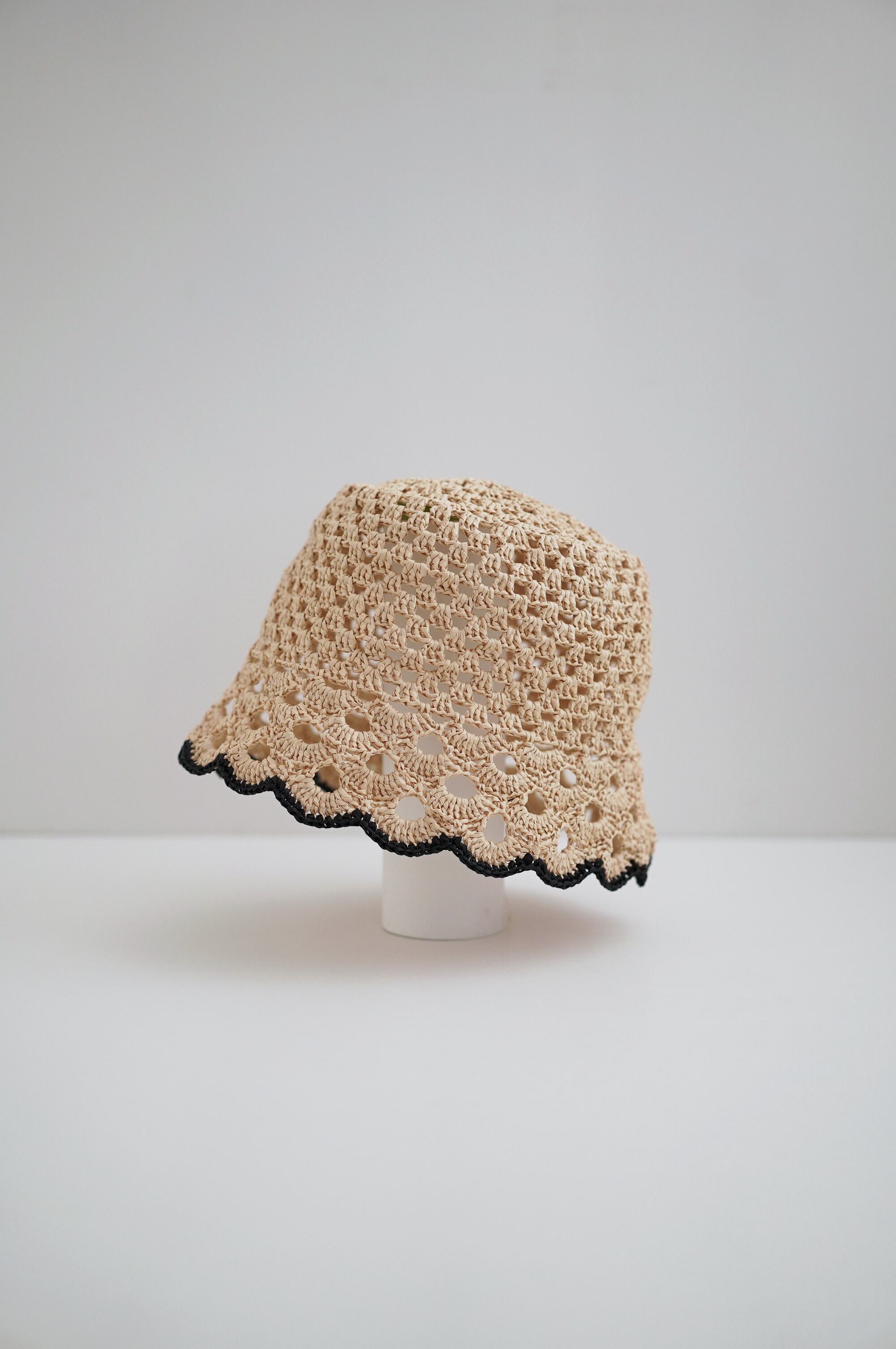 人気のバケットハットに、かぎ針特有の透かし模様とフリルがデザインされています。
