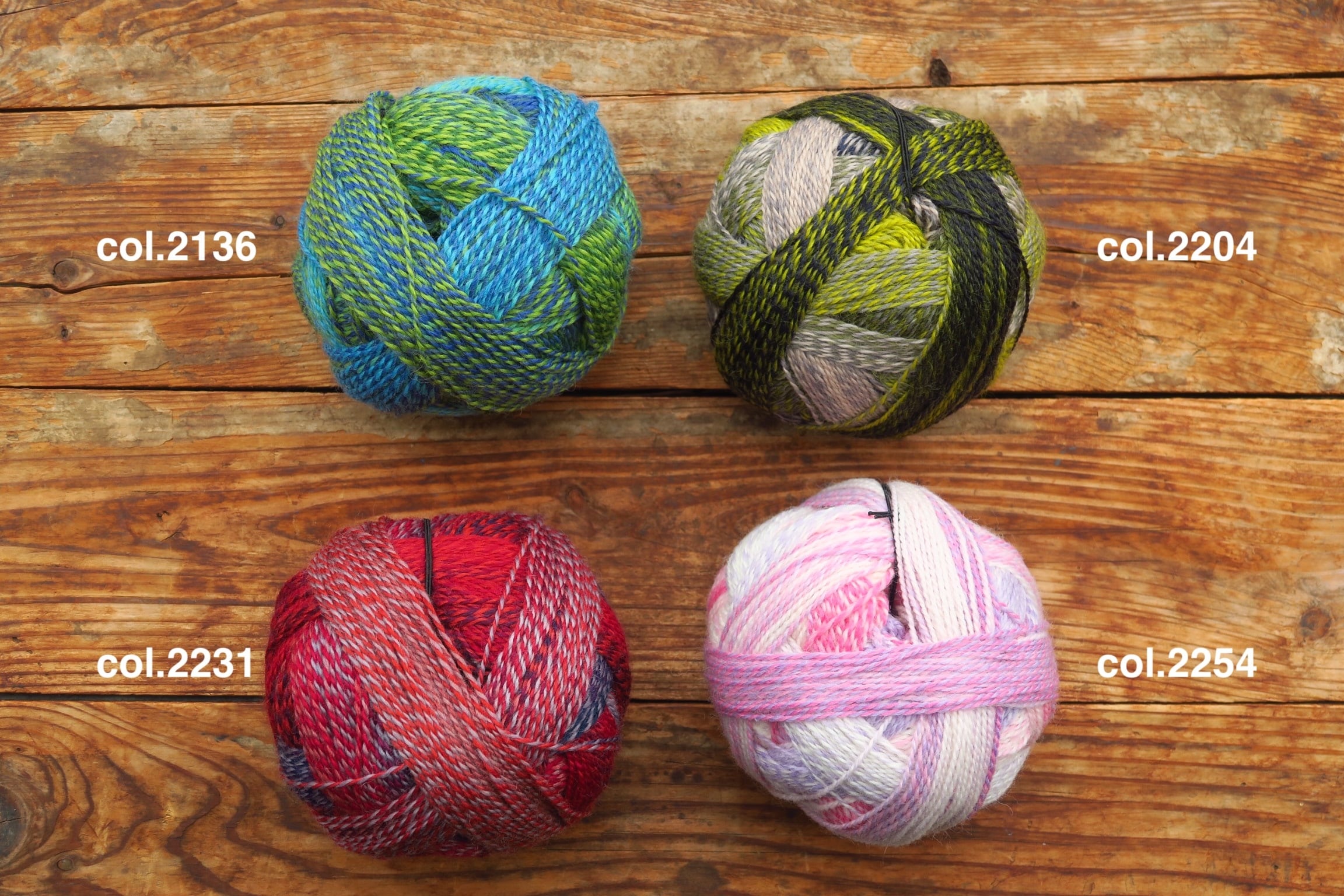 段染めの単糸が2本で双糸に撚られており、編むと絶妙なグラデーションを奏る毛糸です。