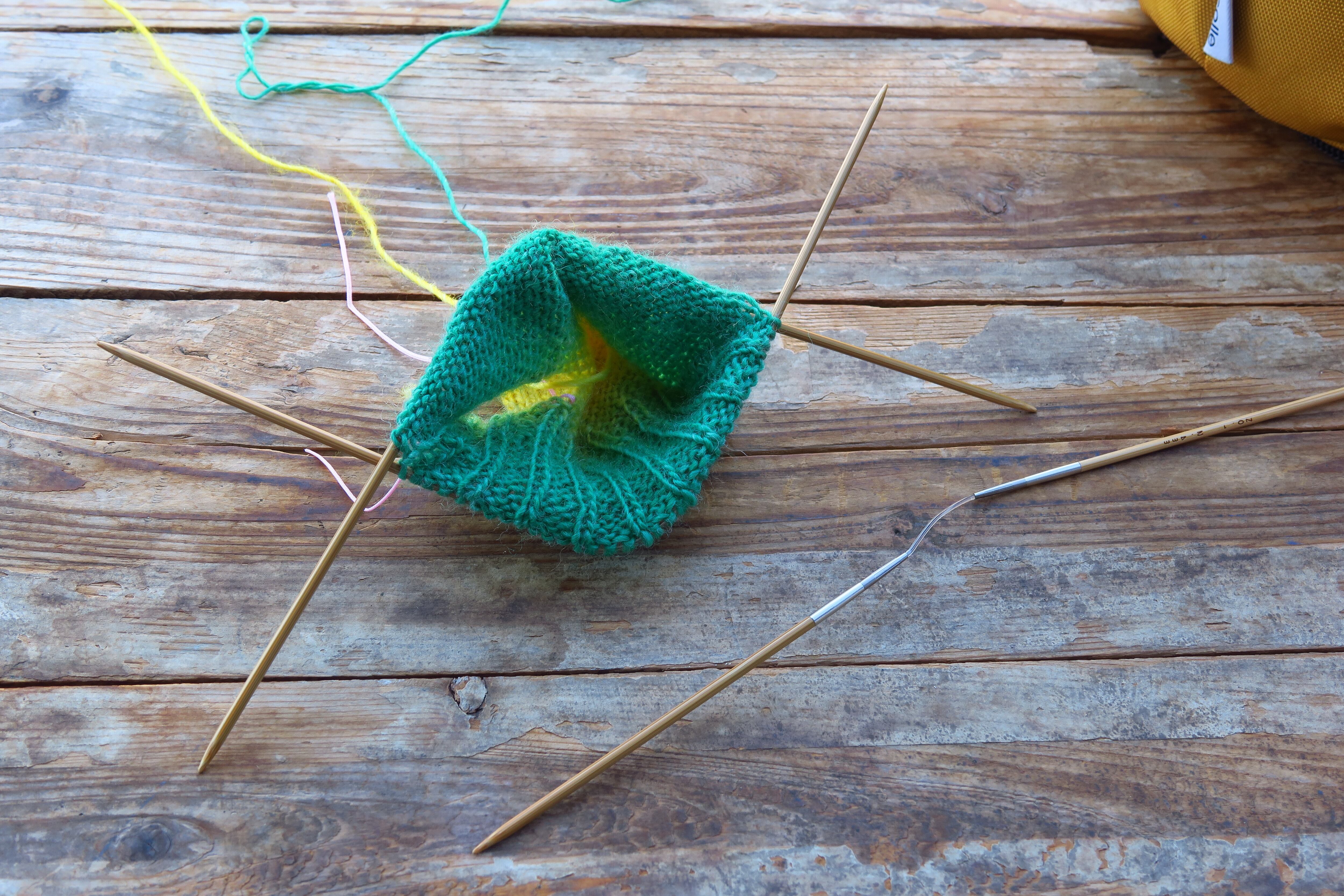 最近はもっぱら輪針を使った”マジックループ”で編んでます。